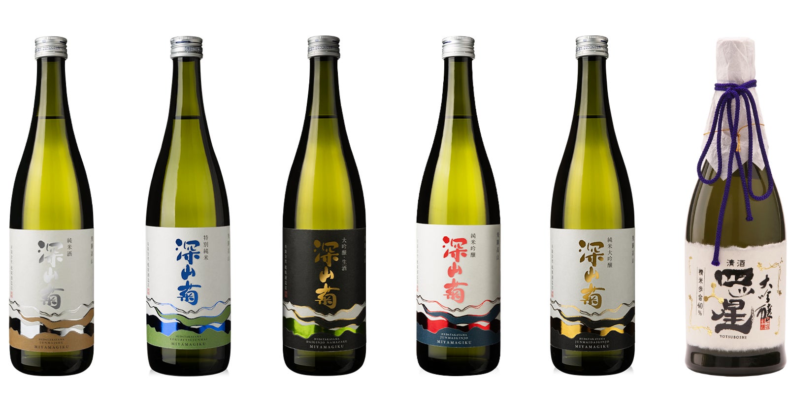 ※商品はすべて720ml。画像は左から、深山菊 純米酒(PB)、特別純米酒(PB)、大吟醸 生酒(PB)、純米吟醸(PB)、純米大吟醸(PB)、大吟醸 四ッ星(NB)
